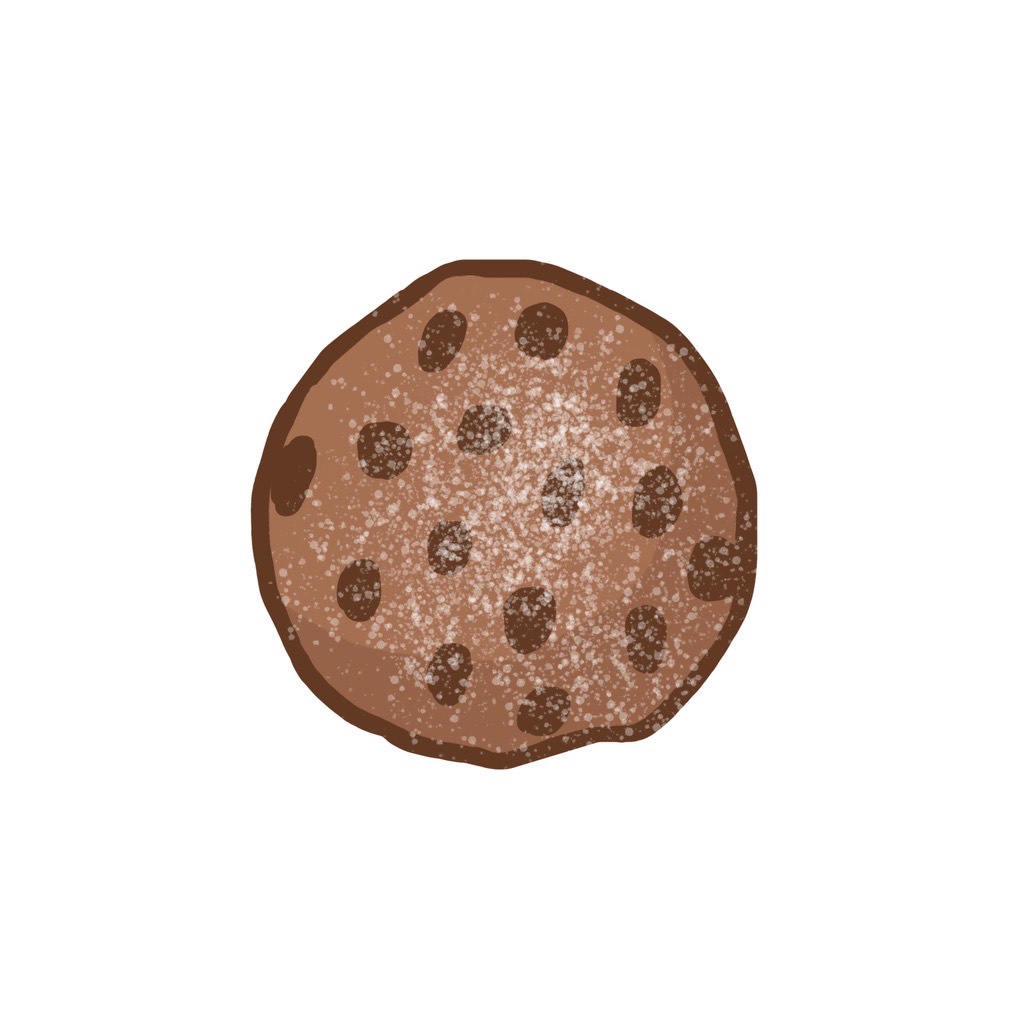 A double chocolate kookie baked with chocolate chips and topped with powdered sugar.